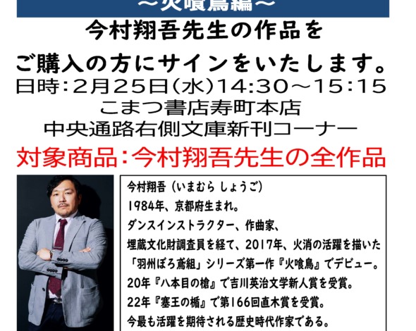 火喰鳥羽州ぼろ鳶組アニメ化記念 今村翔吾の祭り旅~火喰鳥編~ 今村翔吾先生のサイン会を開催します。 日時は2月25日(水)14:30~15:15 当日ご購入いただいた方にサインをいたします。 是非ご来店ください。