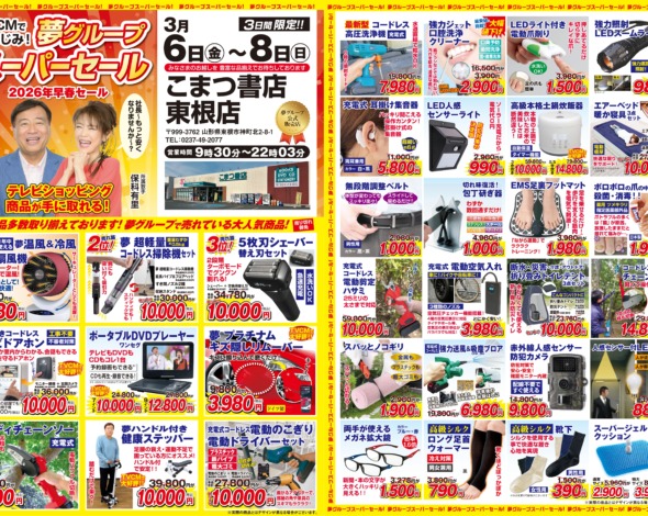 3月6日(金)から3月8日(日)までの3日間限定!! TVCMでおなじみの夢グループの商品が東根店にやってきます。 テレビショッピングの商品を手に取ってお選びいただけるチャンスです。 是非ご来店ください。